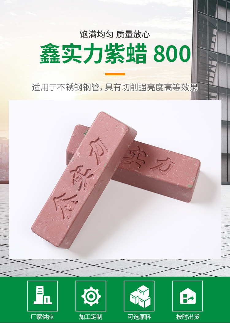 黑蠟:又稱黑紫蠟、鐵蠟、黑油棒等。早前被用于鐵件表面的中拋,因?yàn)樗哂谐康那邢髁Γ蚨渤R?jiàn)于各類金屬如不銹鋼的粗到中拋工序。
