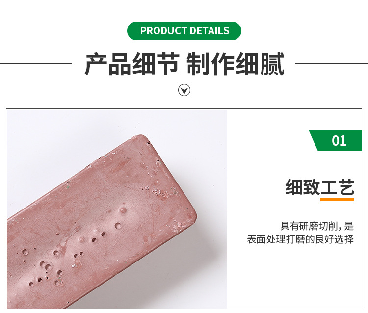 不銹鋼衛(wèi)浴拋光臘采用高強全樹脂砂布為原材料,采用體貼的人性化梯形長條造型在使用時更加稱心應手,使用高強粘度樹脂膠,產品質量穩(wěn)定,外觀美觀。適用行業(yè)非常廣泛,可用于各類不銹鋼衛(wèi)浴表面研磨、拋光,是衛(wèi)浴表面處理打磨的良好選擇。